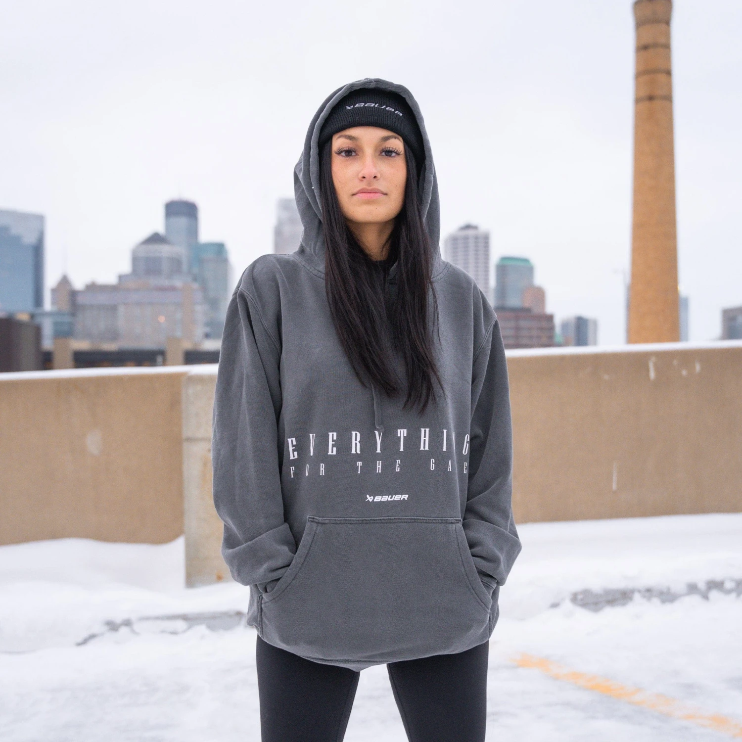 Unisex Midweight Pigment Dyed Hooded Pullover has individual and unique vintage character. This hoodie is as comfortable as it is eye catching, made from ultra soft cotton/polyester blend fleece in vintage black colorway. Features jersey lined hood, sewn eyelets, and 1×1 ribbing at cuffs and waistband in a standard unisex fit. Screen printed graphics.