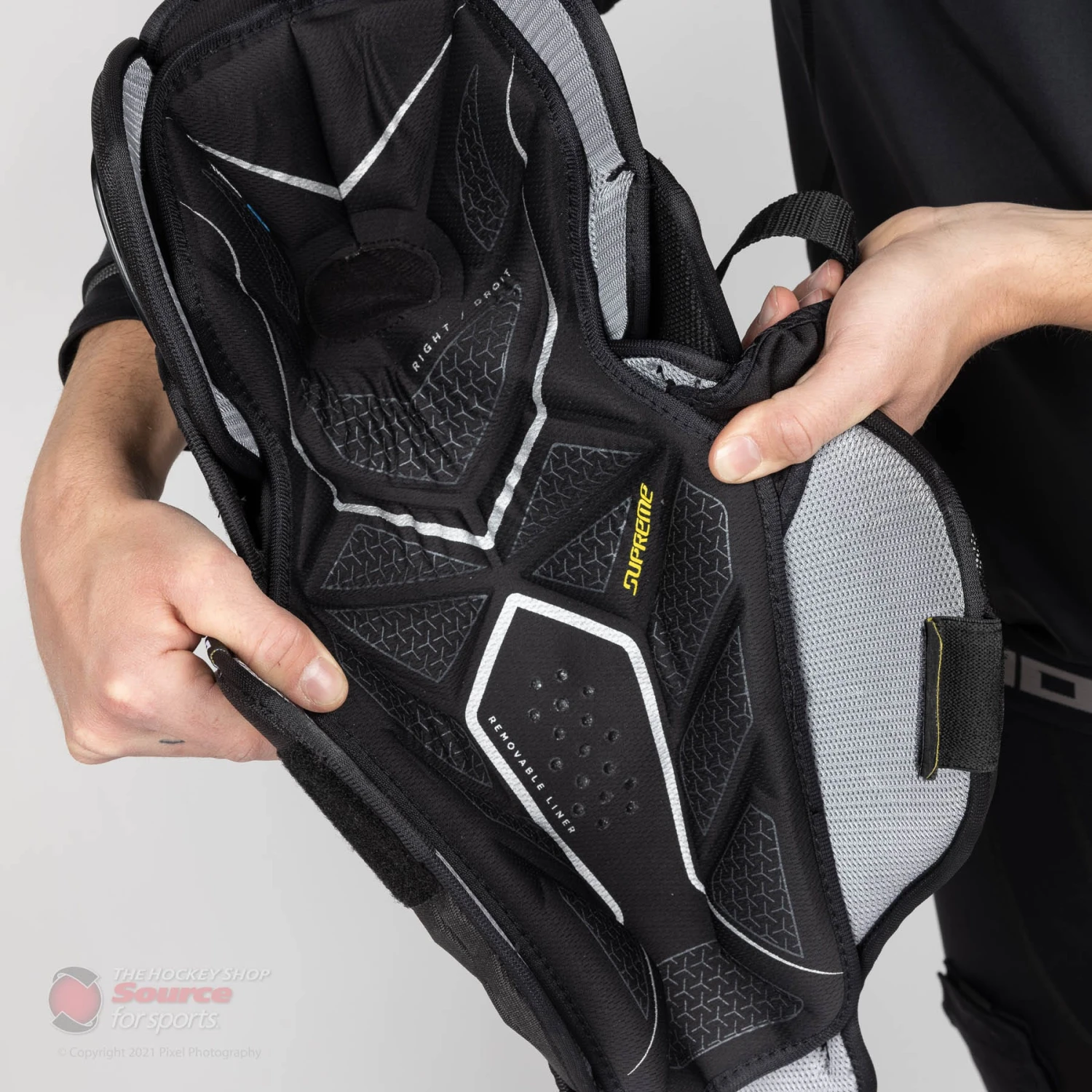 The Bauer Supreme 3S Pro SR Hockey Shin Guards target the performance players. These shin pads are designed for the player on the ice roughly 3-4 times a week looking for features that will help their performance, but at a margin of the price of the UltraSonic. Bauer has designed the 3S pro to maximize the player’s protection without hindering any mobility or comfort in the shin pad. To pull everything together, Bauer decided black out the entire shin pad. Perfect for hiding sweat!