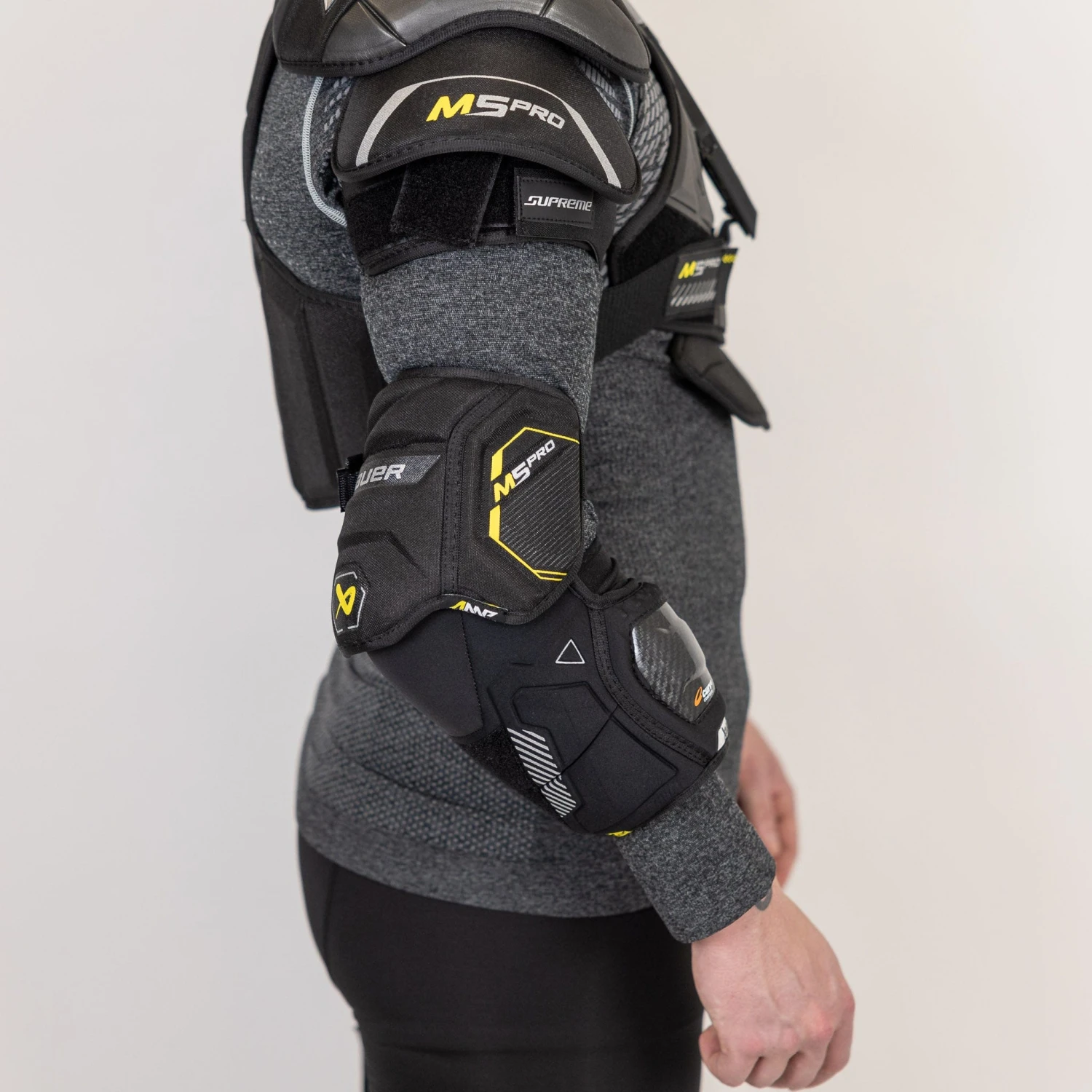 The Bauer Supreme M5 Pro elbow pads are built with a 2-piece construction, offering a dynamic and flexible fit for players. The innovative split bicep design enhances mobility and freedom of movement, allowing players to perform unrestricted on the ice. With this construction, the elbow pads offer a comfortable and secure fit, ensuring great protection during intense gameplay without hindering performance.