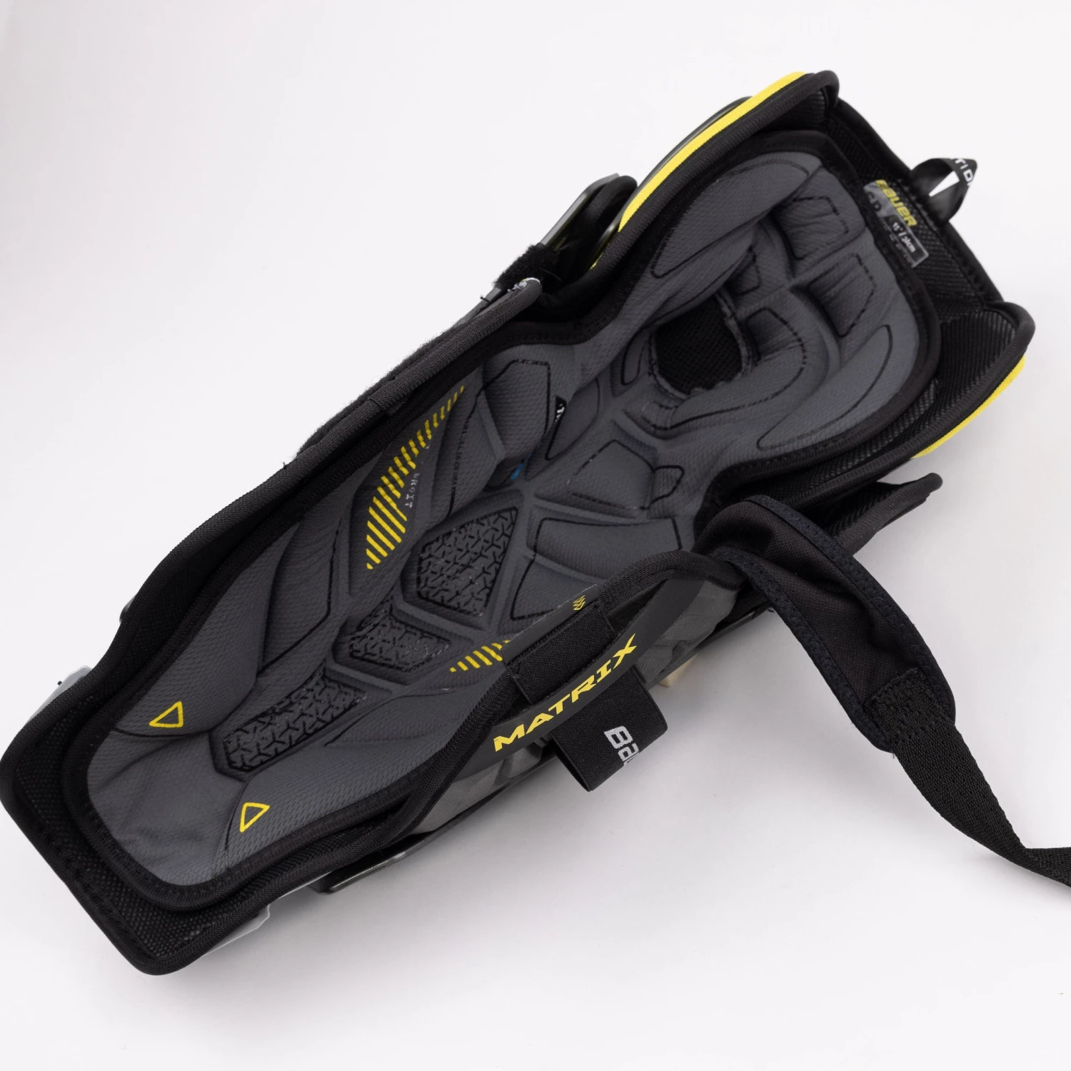 The Bauer Matrix shin guards are equipped with the advanced X-Flex shield shin cap, offering enhanced mobility and improved skating stride. The X-Flex shield shin cap features a hinged flex design that allows for a more natural and unrestricted range of motion while skating, ensuring that players can move with greater ease and efficiency on the ice.