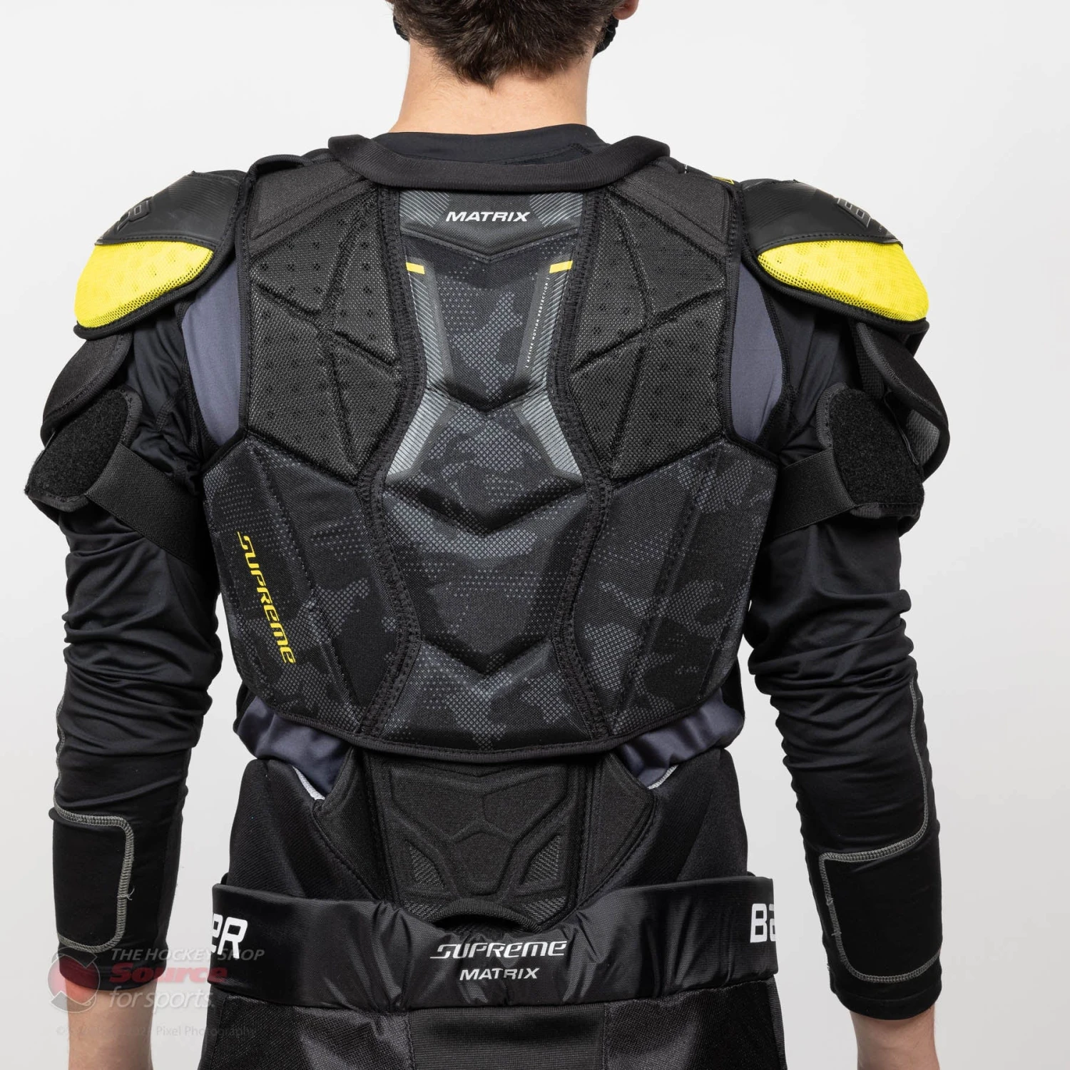 The spine protection on the Supreme Matrix shoulder pad consists of a molded High-Density foam. The back panel underneath the spine insert is a full coverage molded vest that extends around to the ribs to cover any unprotected areas on the upper body.