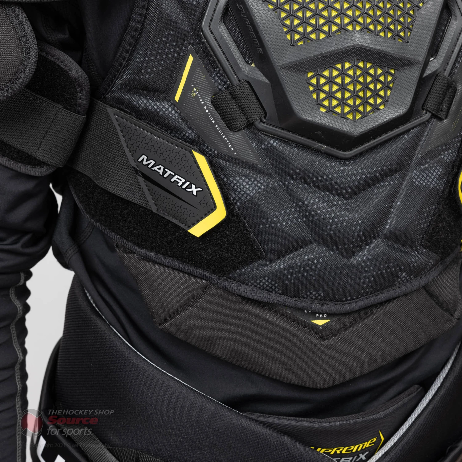 The Supreme Matrix shoulder pad features an adjustable split bicep that is also found on the UltraSonic. The AMP technology design within the bicep pieces has no restriction in movement and allows you to have a full range of motion on the ice.