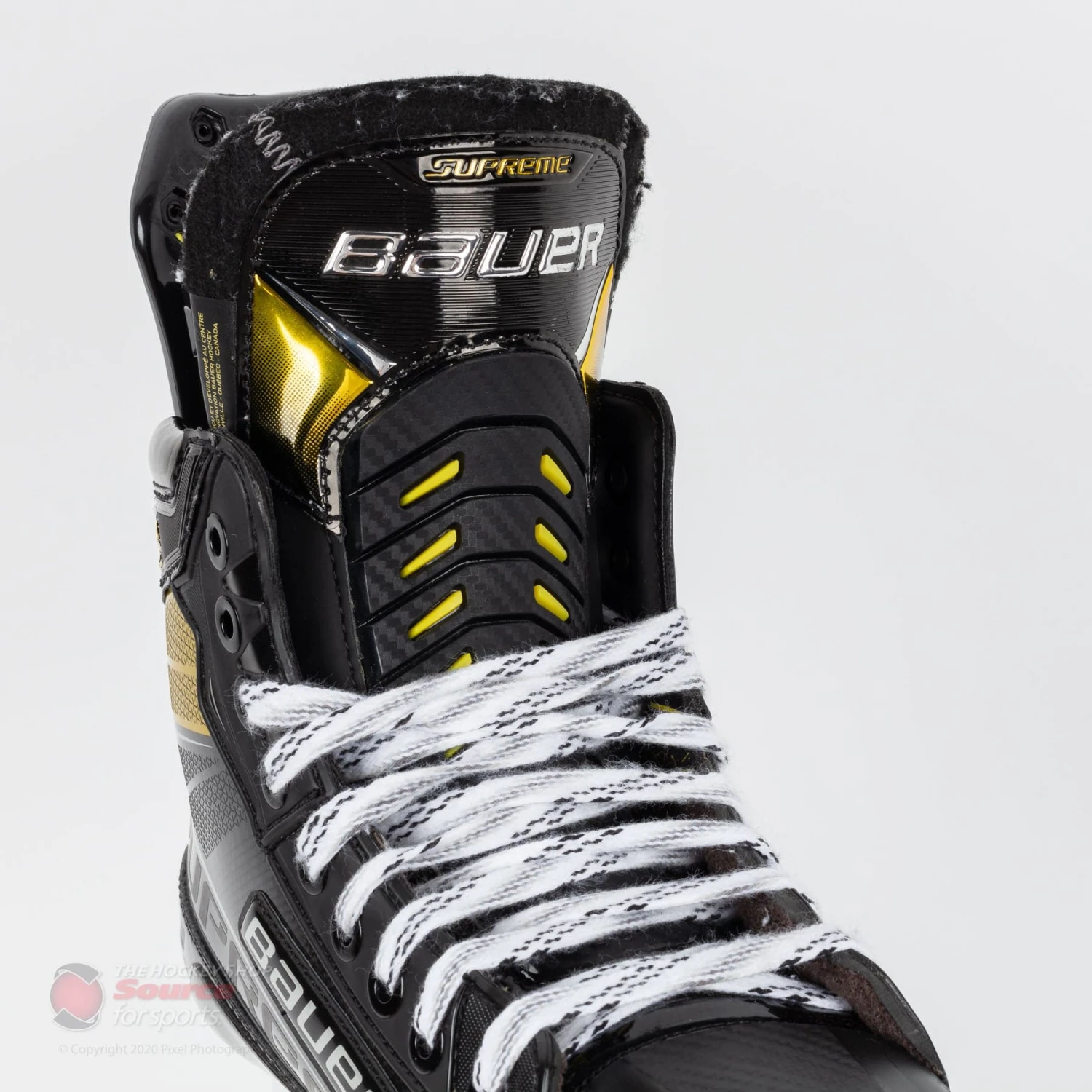 Bauer has made an audacious move regarding the graphics of the Supreme Ultrasonic Senior skate. Normally the Supreme line has a base layer of mainly black with gold trim to add attention and pop to the eye. This year’s sleek, asymmetrical boot has suited up in the same sleek black boot but with a large gold banner wrapping the ankle. This has definitely given the skate a charged up look compared to its older models in previous years.