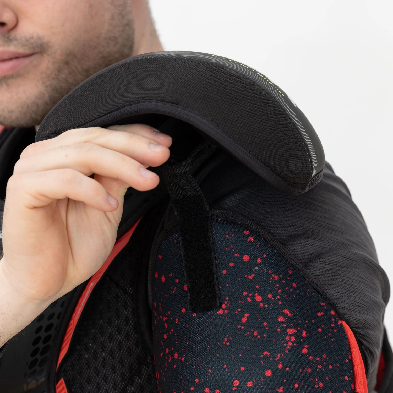 The Vapor line is all about speed and maneuverability. As such, the bicep on the 3X is adjustable and made with molded PE inserts for a closer and more lightweight fit. PE shields are a traditionally reliable option for optimal lightweight protection, which is a main reason why they were used here in Bauer’s competitive-level shoulder pad.