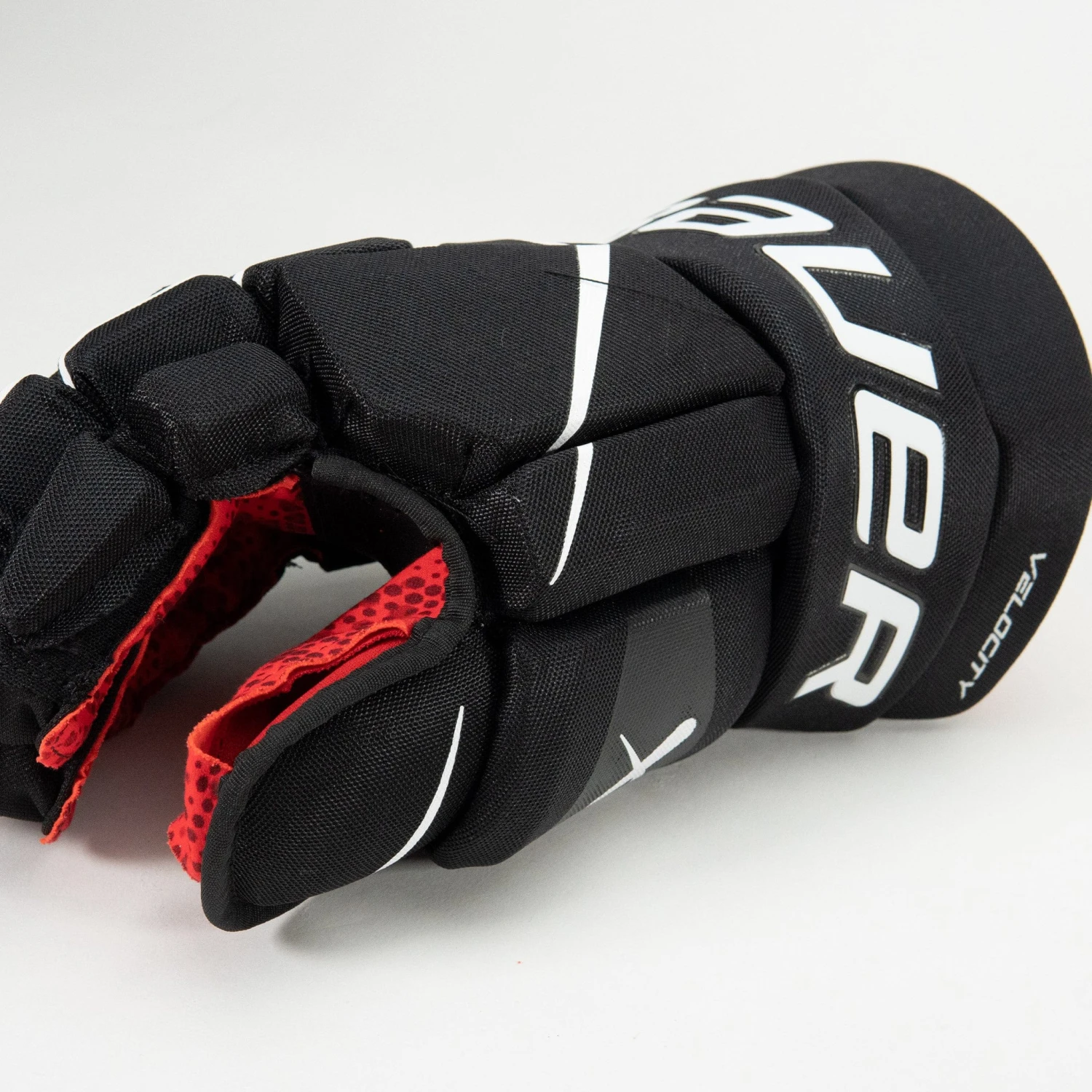 The Velocity glove uses a grey Connekt palm with a full overlay. This construction offers the wearer maximum comfort and a closer, “connected” feel to the stick and the puck, in addition to having some extra durability. Making this area of the glove more durable has been a major focus in modern times as an increasing number of hockey sticks are being developed with more grip. The polyknit gussets also help keep the fingers malleable enough to move with you and your game.