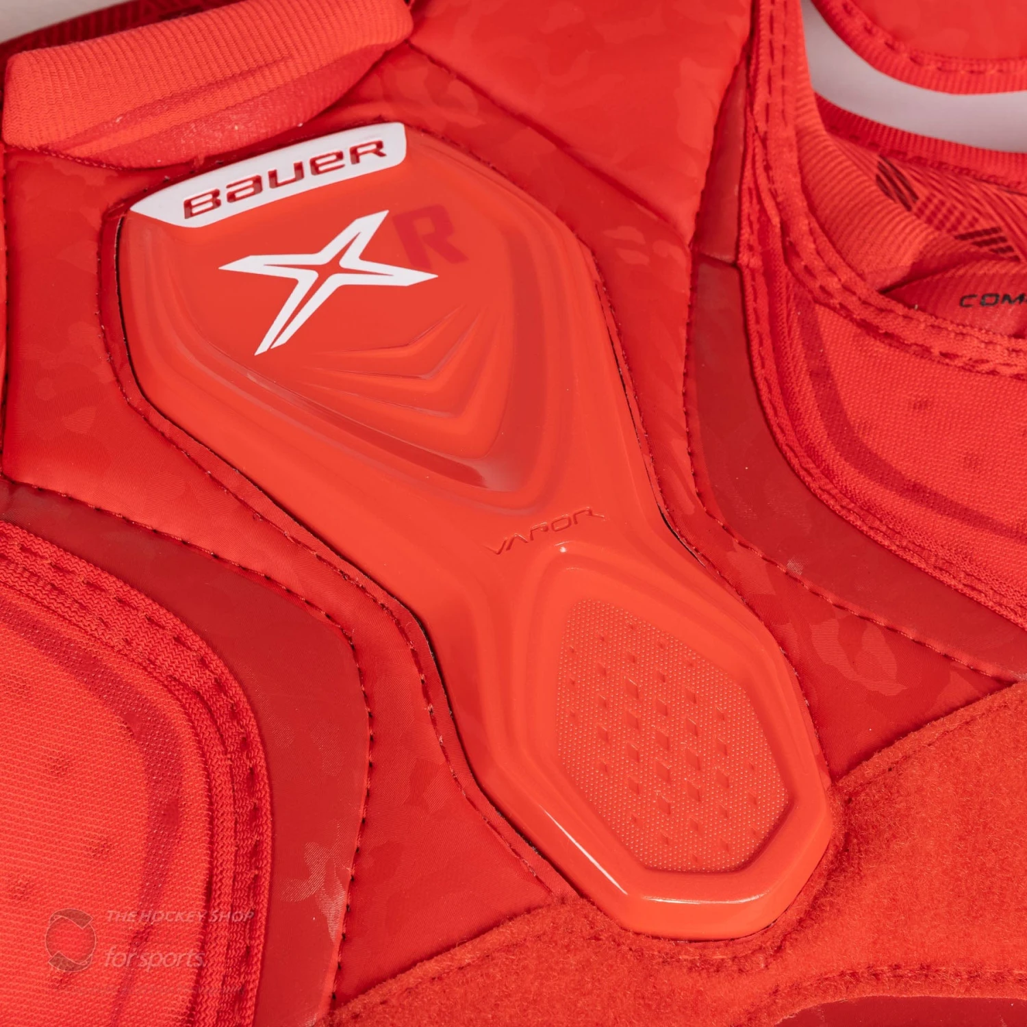 The Vapor X-R Protective line-up is a unique product launch from Bauer, featuring a bright red base with white highlights. The X-R shoulder pad features X-LITE SHIELD sternum protection with FLEXCELL foam throughout the front, back and side panels of the pad. The spine is molded and independent from the pad, and the bicep protectors are adjustable with MD foam and a molded PE insert. . Finished with a sublimated THERMO MAX liner, the X-R shoulder pad delivers protection, comfort, and lots of personality.