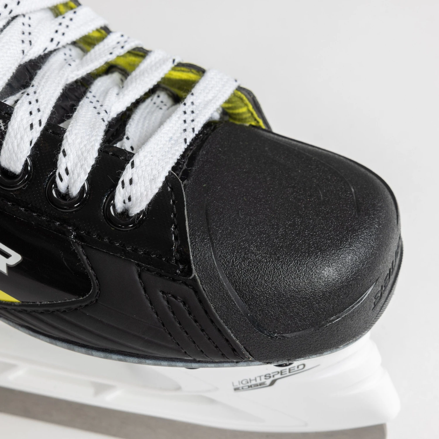 For a better overall fit and to negate any unused space within the boot, Bauer turned to using an asymmetrical toe cap, a concept that has been observed in previous high-end Bauer skates.