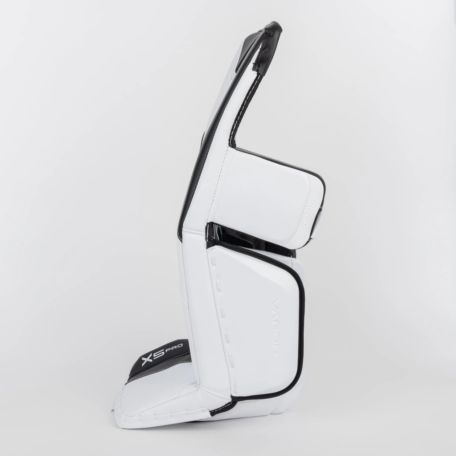 The Vapor X5 leg pads use a pre-curved single break design. This means that the pad is already shaped with a pre-curve in the leg channel, allowing it to conform to the goaltender’s leg shape more easily. This design is intended to provide a more natural and comfortable fit, as well as increased flexibility and mobility for the goaltender.